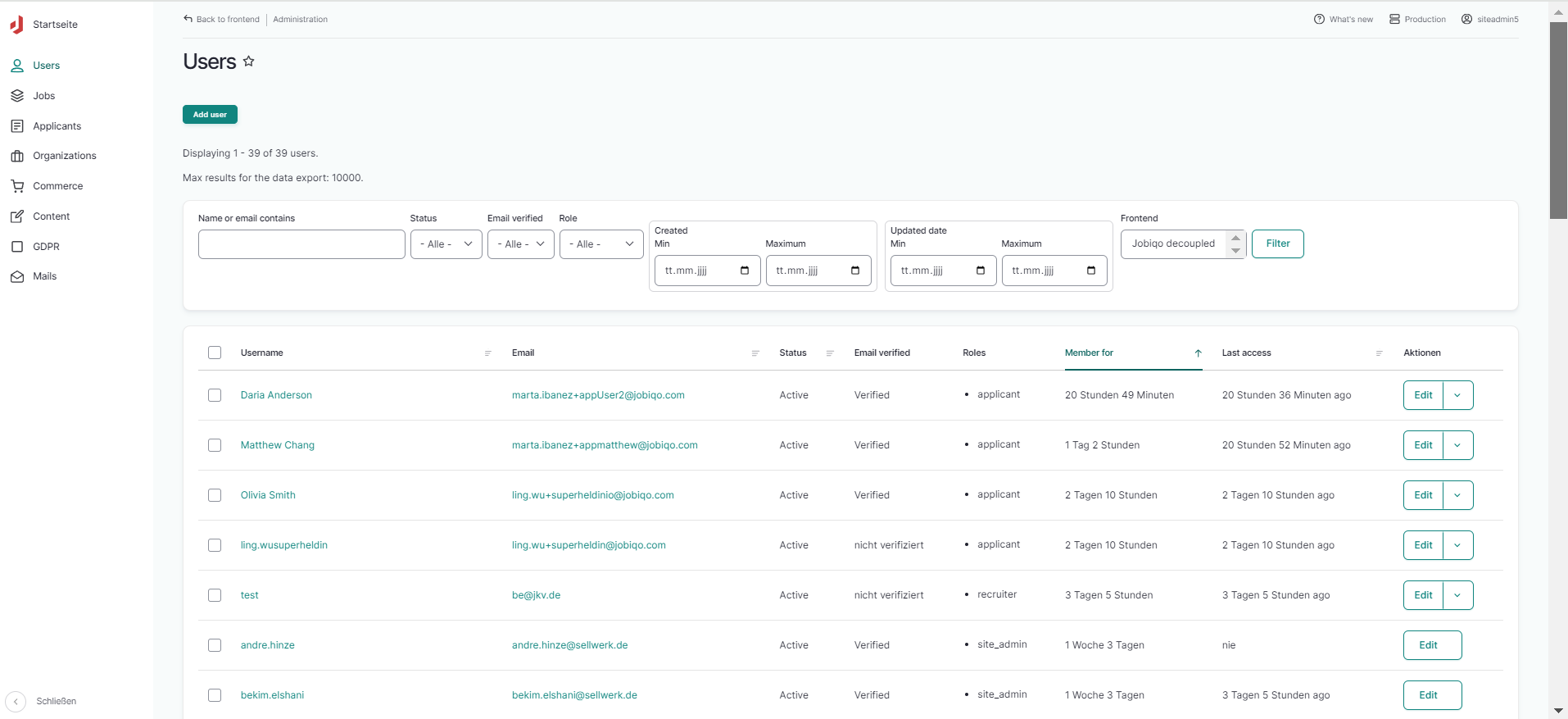 (z. B. E-Mail-Adresse, Rolle) ermöglichen es dir nach bestimmten Benutzern zu suchen. Informationen wie die E-Mail-Adresse, der Status und seit wann sie ein Konto haben, können direkt in der User-Ansicht eingesehen werden.